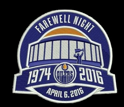 The Edmonton players wore this patch to commemorate their last home game at the Rexall Place in Edmonton, Alberta. The Oilers gave their fans something to cheer and won 6-2 against the Vancouver Canucks.